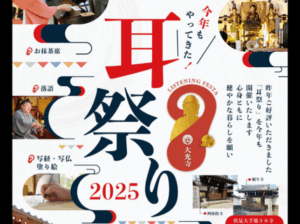耳祭りとは 耳祭り #とは 耳祭り2025 [会場]大光寺 京都市伏見区伯耆町1-1 11/8(土) 開催時間:9:00-16:00 雨天の場合も開催です 耳への感謝と、祈りを捧ぐお祭り 平安中期作、耳のご利益で深く信仰 … 続きを読む 京都伏見耳祭り2025 – 大光寺 –